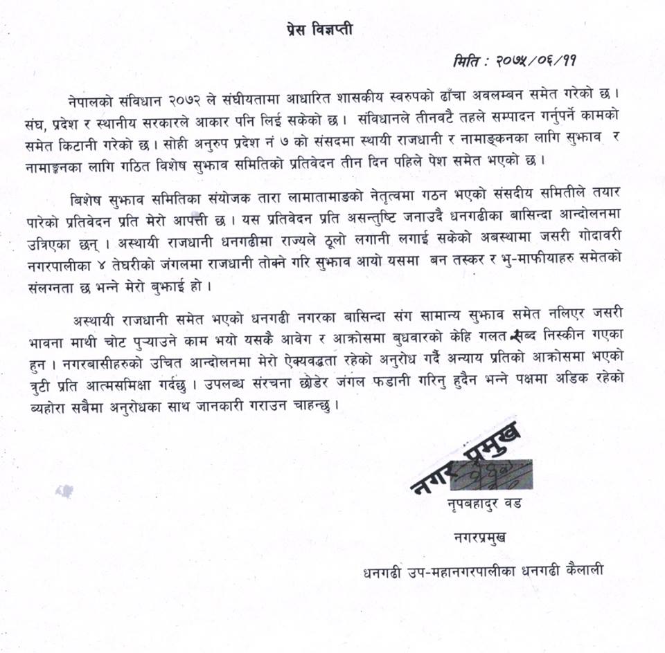 प्रदेश ७ को राजधानी धनगढीवाट अत्तरीया राख्ने प्रस्तावपछि धनगढीमा भएको आन्दोलन प्रदेश सरकार र सांसदहरुलाई धनगढी छोड्न अल्टिमेटम दिएका मेयर नृप ओडले आक्रोसमा गलत शब्द बोलेको स्वीकार गरेका छन्।